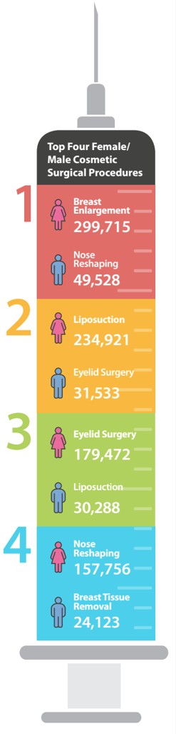 As it becomes more socially acceptable, we are witnessing tremendous increase in cosmetic1 plastic surgery. According to 2019 figures from the International Society for Aesthetic Plastic Surgery (ISAPS), more than twenty-five million cosmetic surgical and nonsurgical procedures were performed worldwide-a figure expected to continue rising. The US still has the most procedures overall, with Brazil gaining ground steadily. But South Korea tops the list in terms of per capita2 procedures. Figures vary, but polls place the rate between twenty and thirty-five percent of the population. One BBC poll reported upwards of fifty percent of South Korean women in their twenties have "had some work done." Globally, the top three surgical procedures for women were breast enlargement, liposuction, and eyelid surgery, while the top three surgical procedures for men were nose reshaping, eyelid surgery, and liposuction.